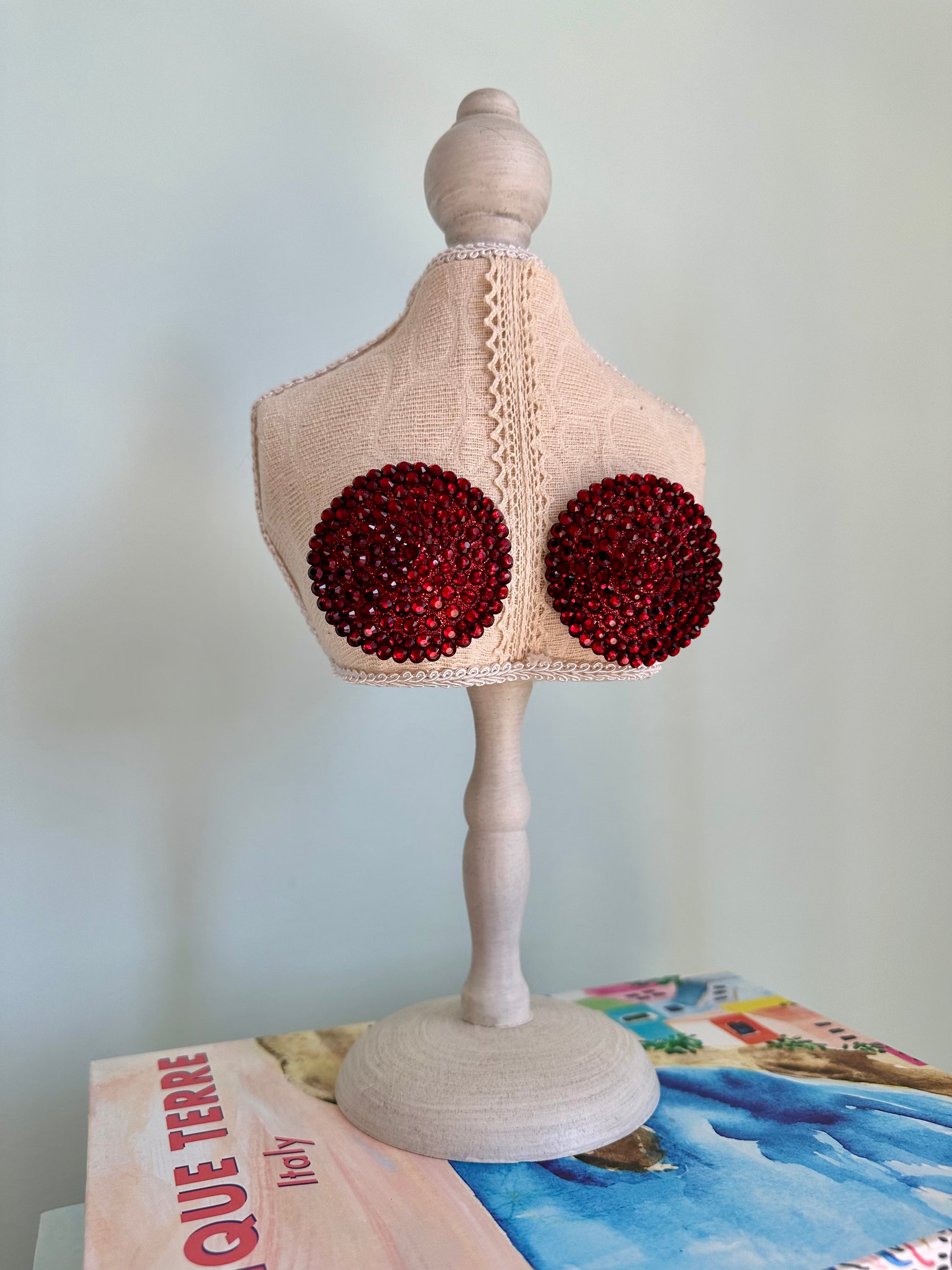 Personalize your burlesque routine with these Birthstone pasties! Handmade, vegan leather pasties sparkle with intricate designs of crystal rhinestones No worries if things get a little messy—the leatherette material makes for easy cleaning and reuse!