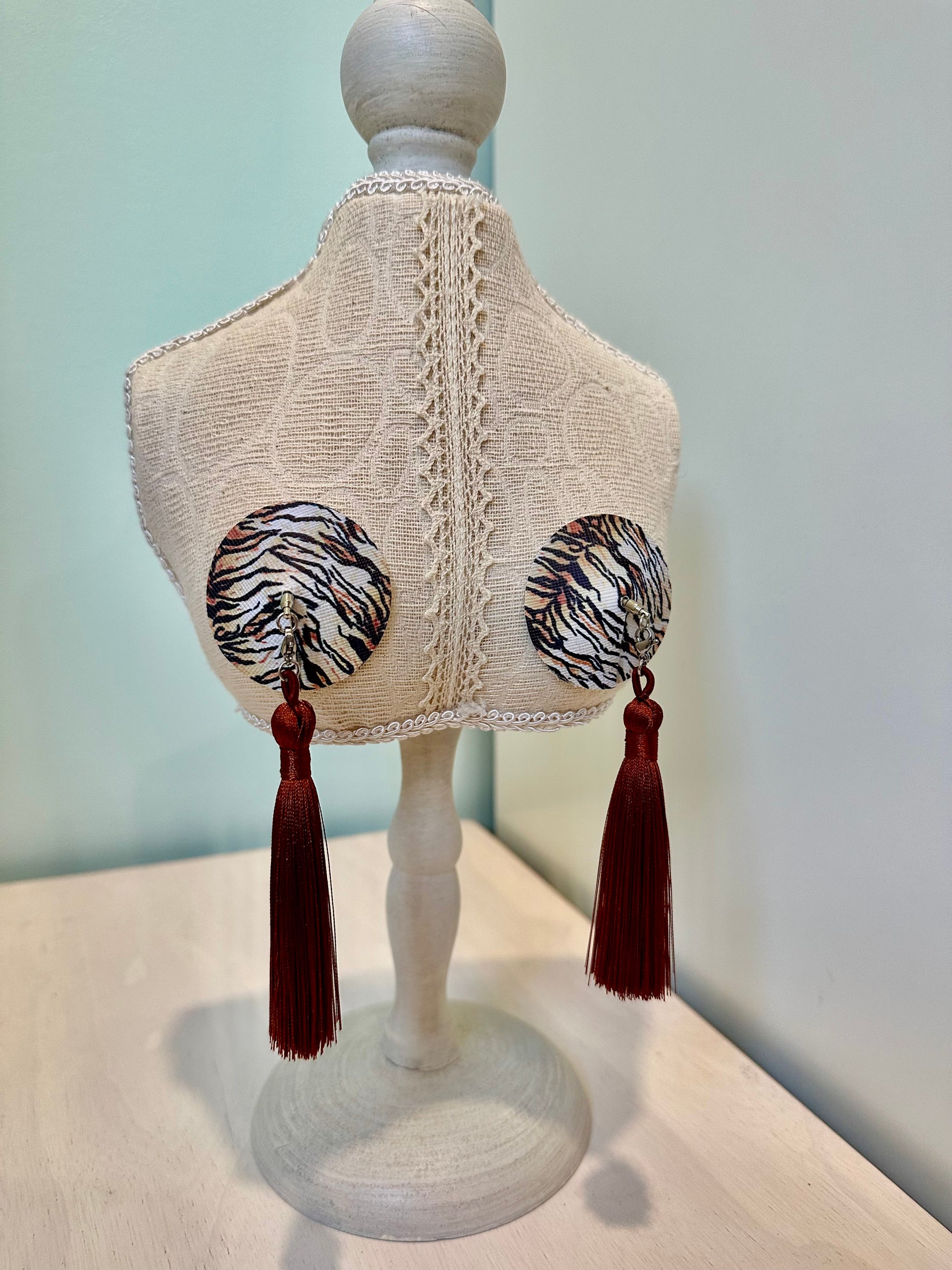This set comes with 1 pair of circular and teardrop per pattern, and 1 pair of glittering gold circular pasties. That’s 5 pairs for $50! Plus, this set comes with a pair of espresso brown or terracotta brown tassels that can be used interchangeably through the 5 sets.