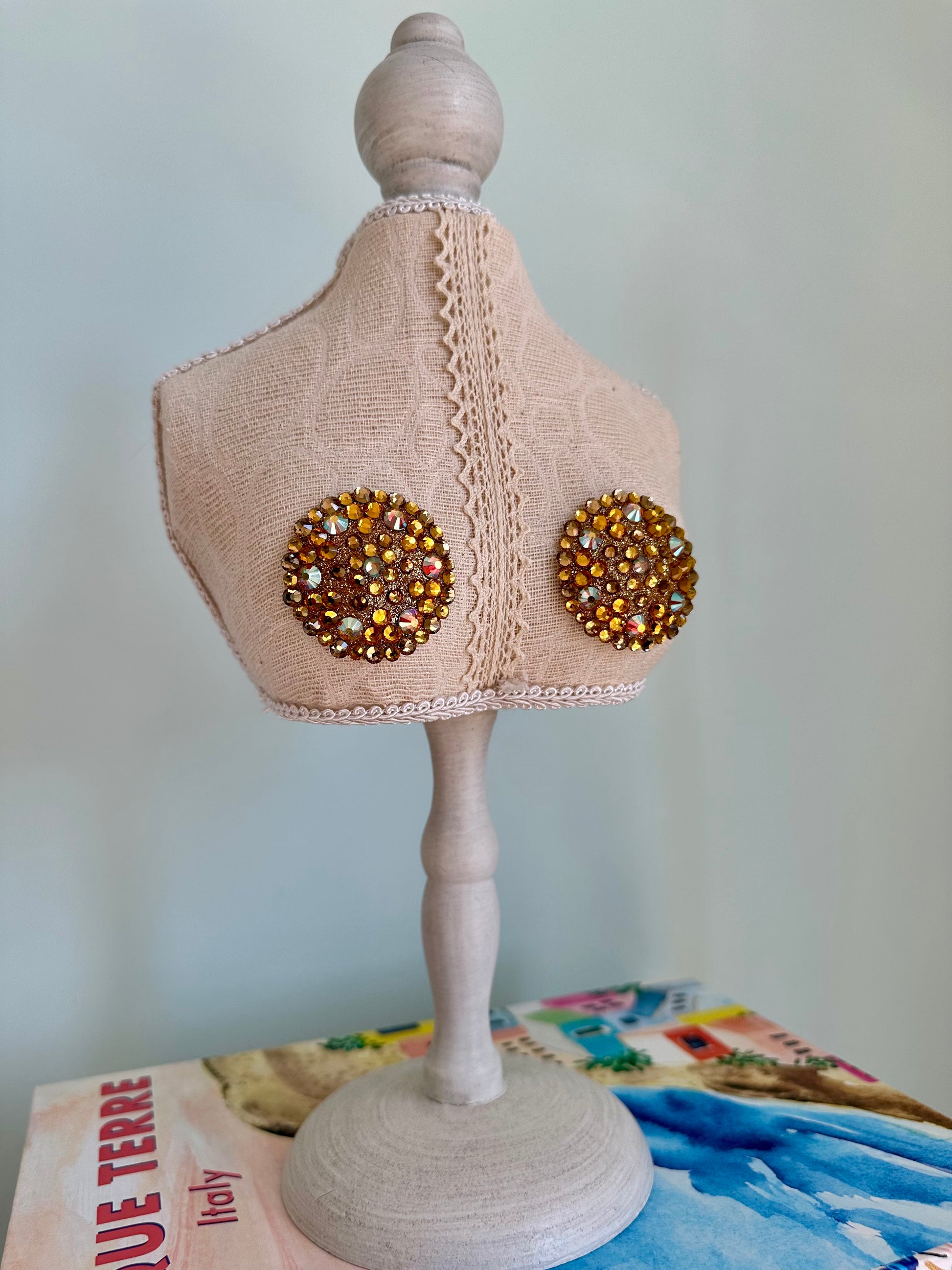 Personalize your burlesque routine with these Birthstone pasties! Handmade, vegan leather pasties sparkle with intricate designs of crystal rhinestones No worries if things get a little messy—the leatherette material makes for easy cleaning and reuse!