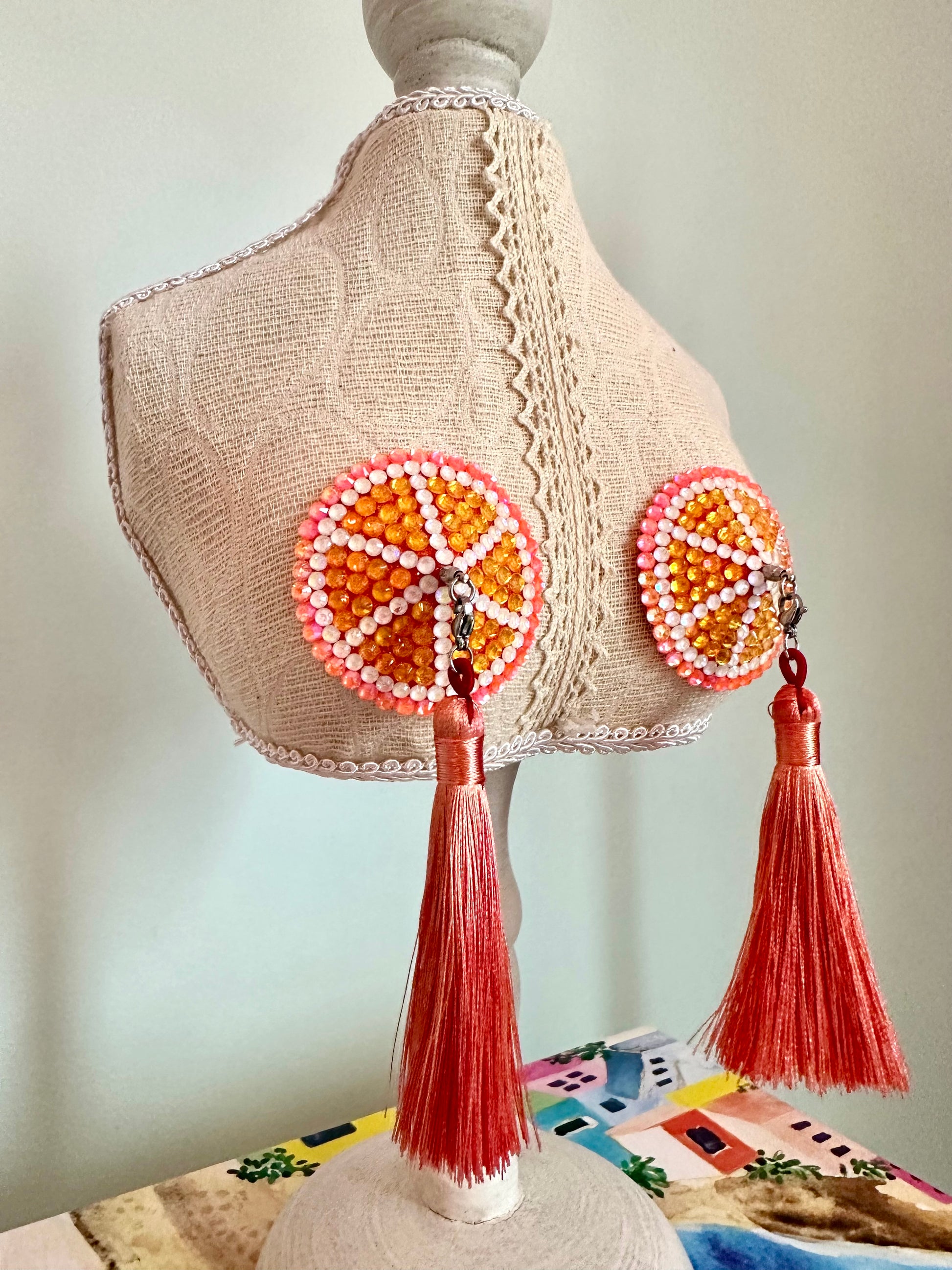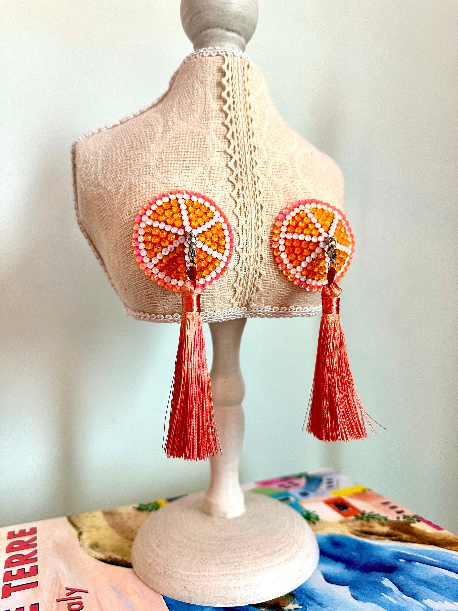 Freshly squeezed, just for you 🍊 These handmade, vegan leather pasties sparkle with intricate designs of crystal rhinestones. These feature removable nylon tassels, with 360° spinners! No worries if things get a little messy—the leatherette material makes for easy cleaning and reuse!