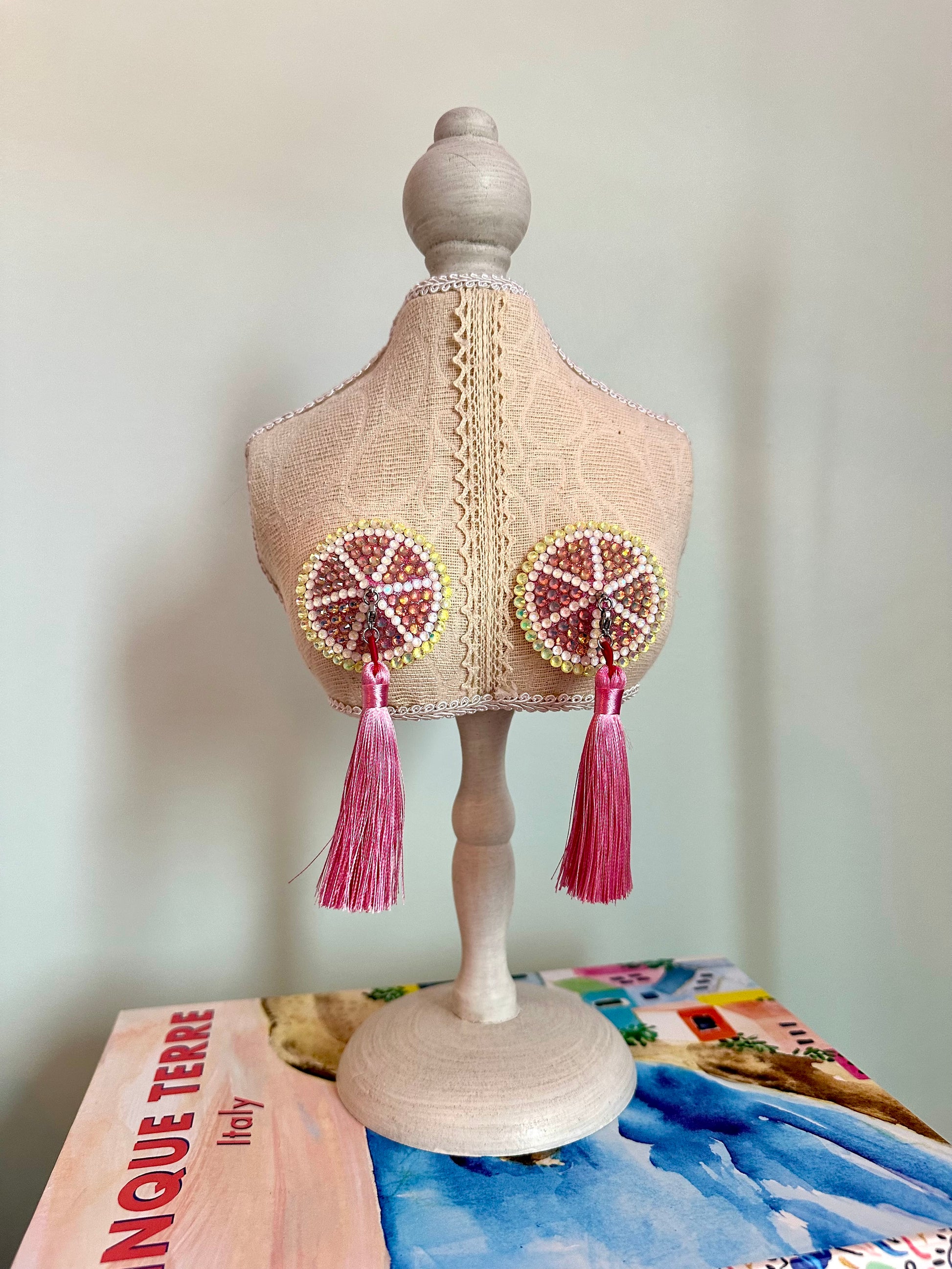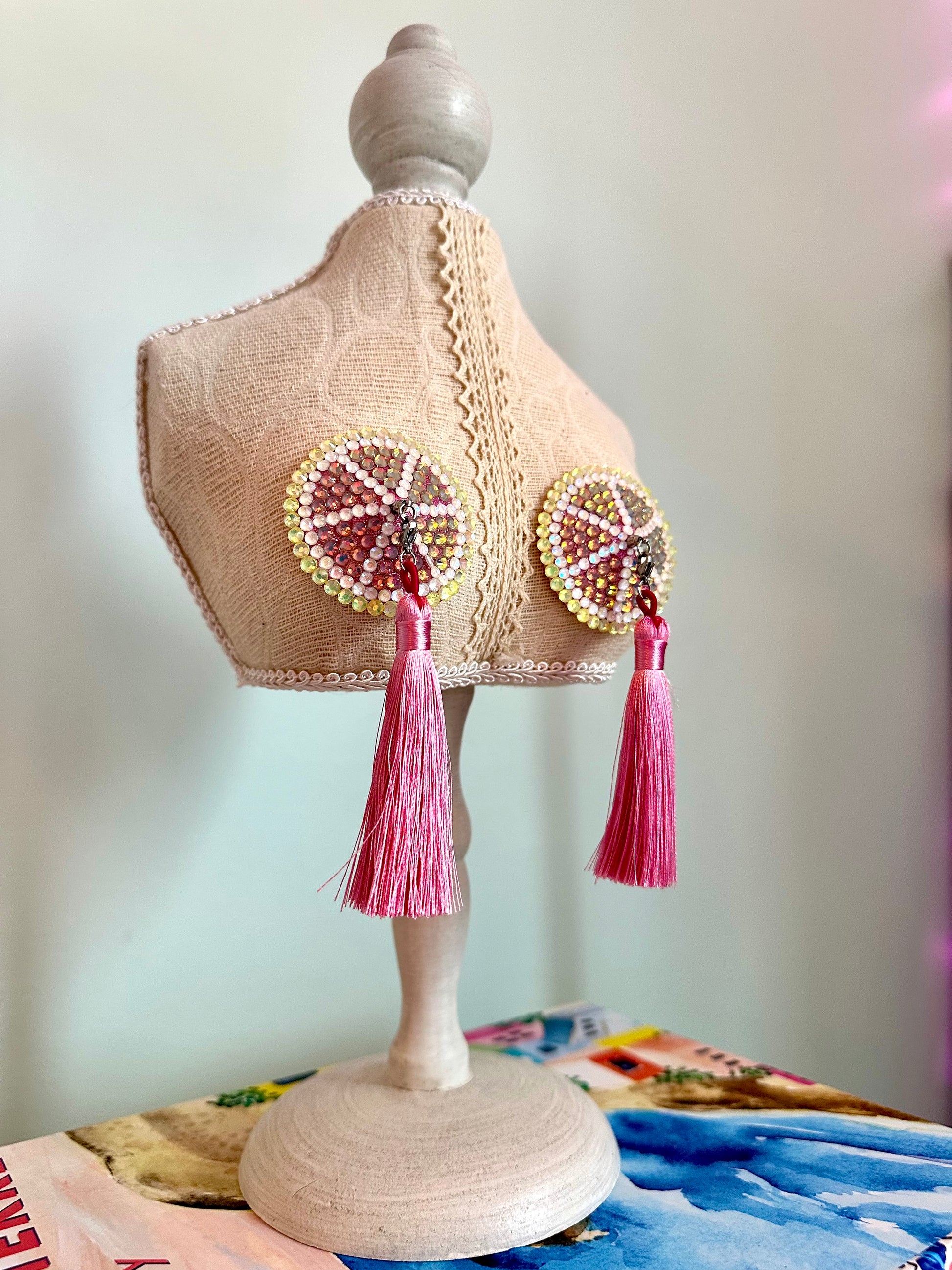 Freshly squeezed, just for you🍋 These handmade, vegan leather pasties sparkle with intricate designs of crystal rhinestones. These feature removable nylon tassels, with 360° spinners! No worries if things get a little messy—the leatherette material makes for easy cleaning and reuse!