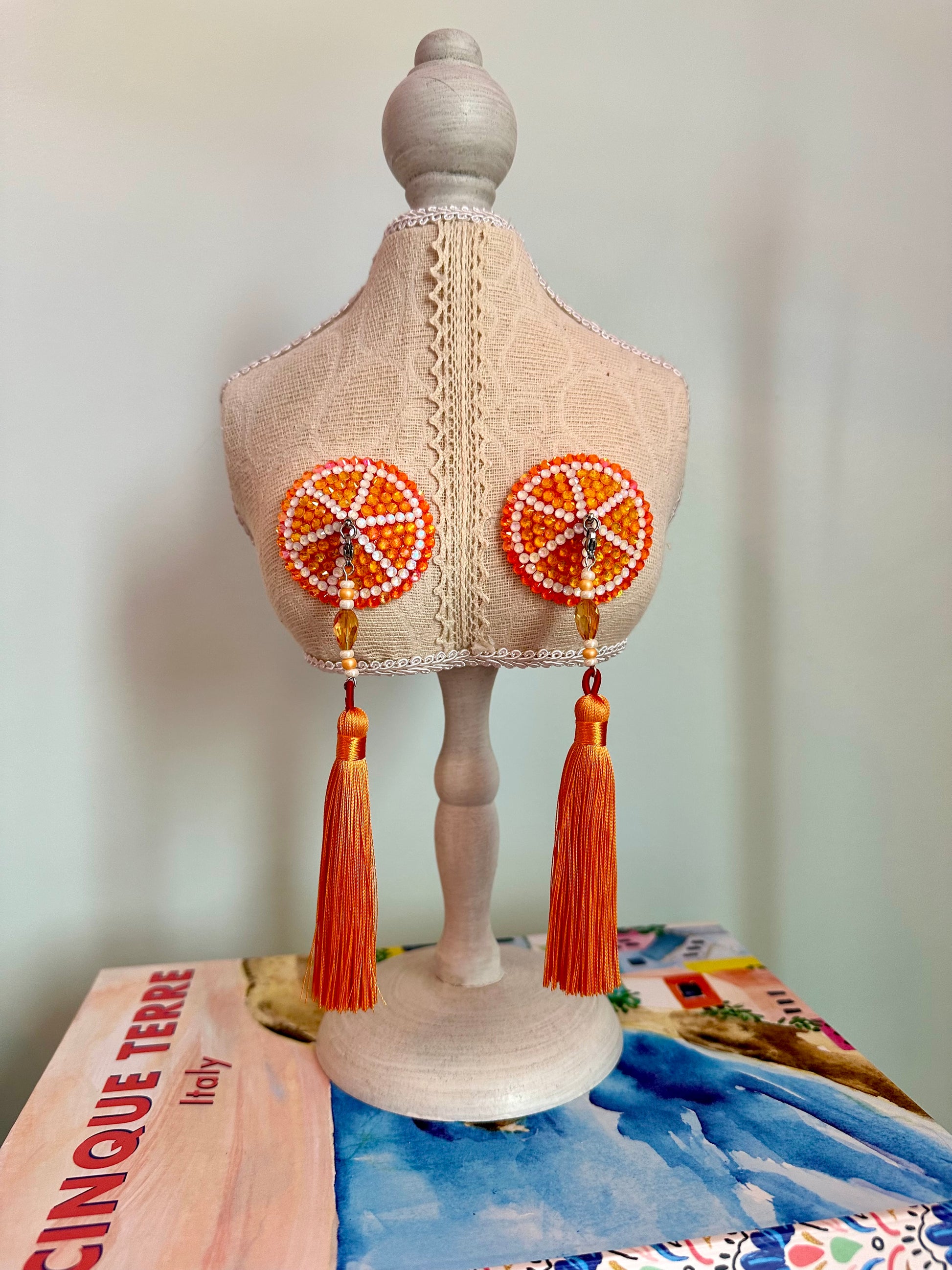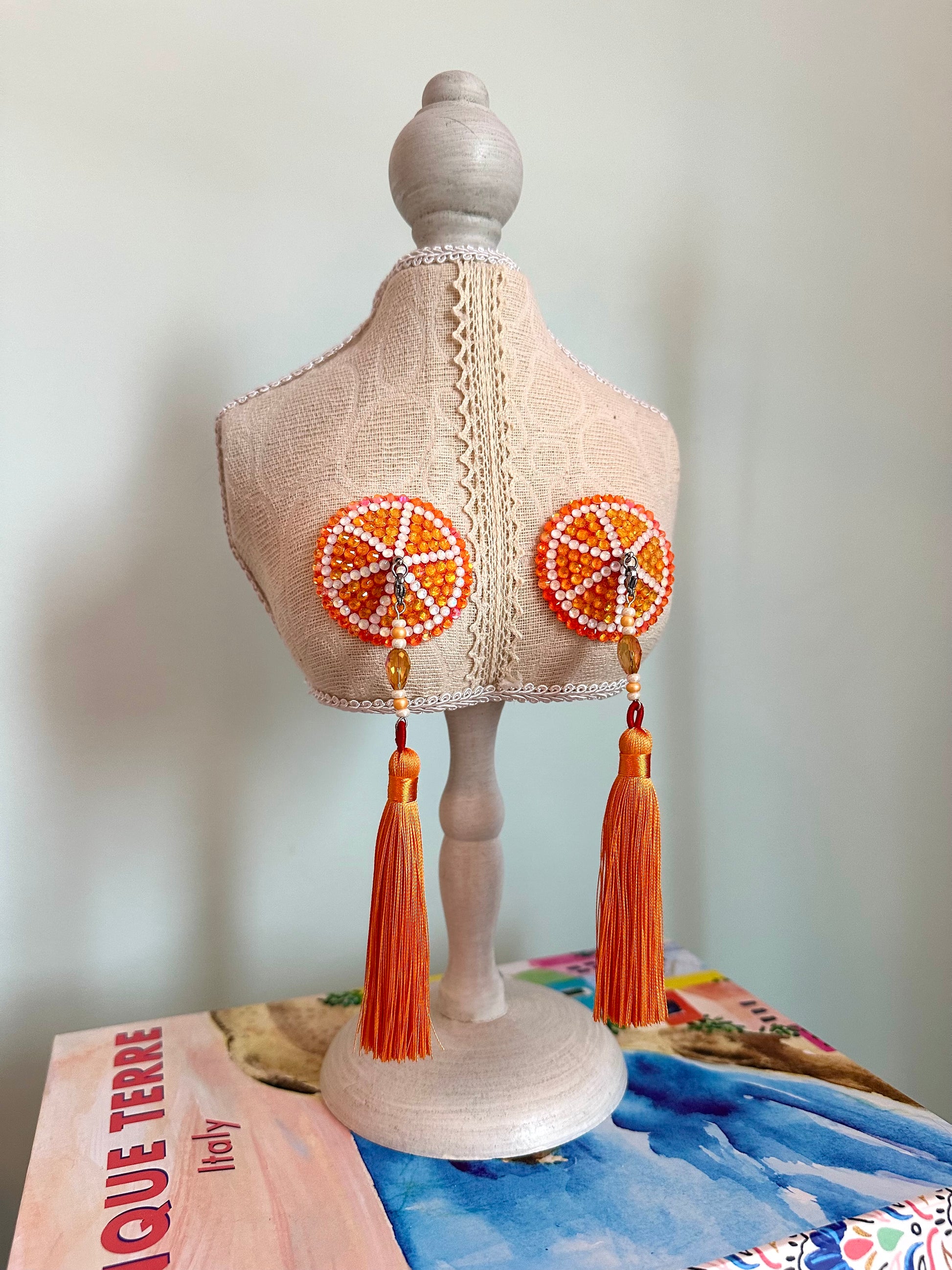 Freshly squeezed, just for you 🍊 These handmade, vegan leather pasties sparkle with intricate designs of crystal rhinestones. These feature removable nylon tassels, with 360° spinners! No worries if things get a little messy—the leatherette material makes for easy cleaning and reuse!