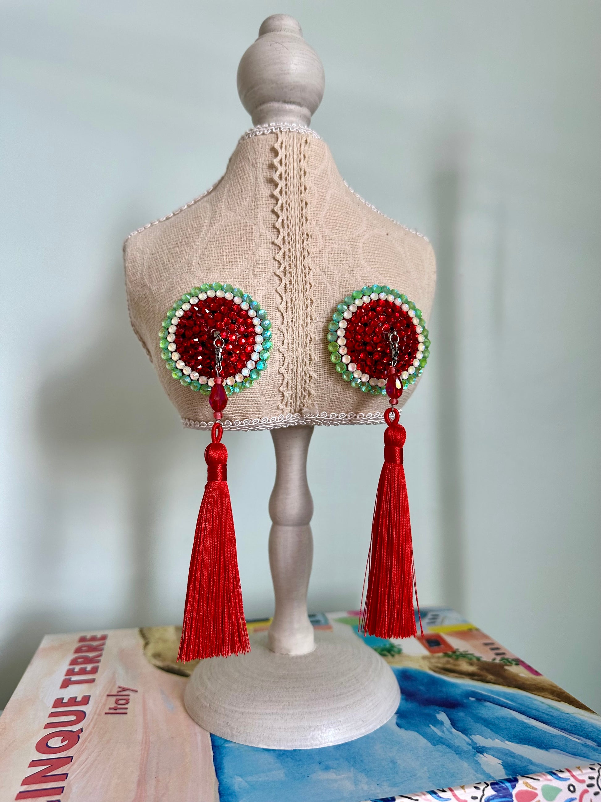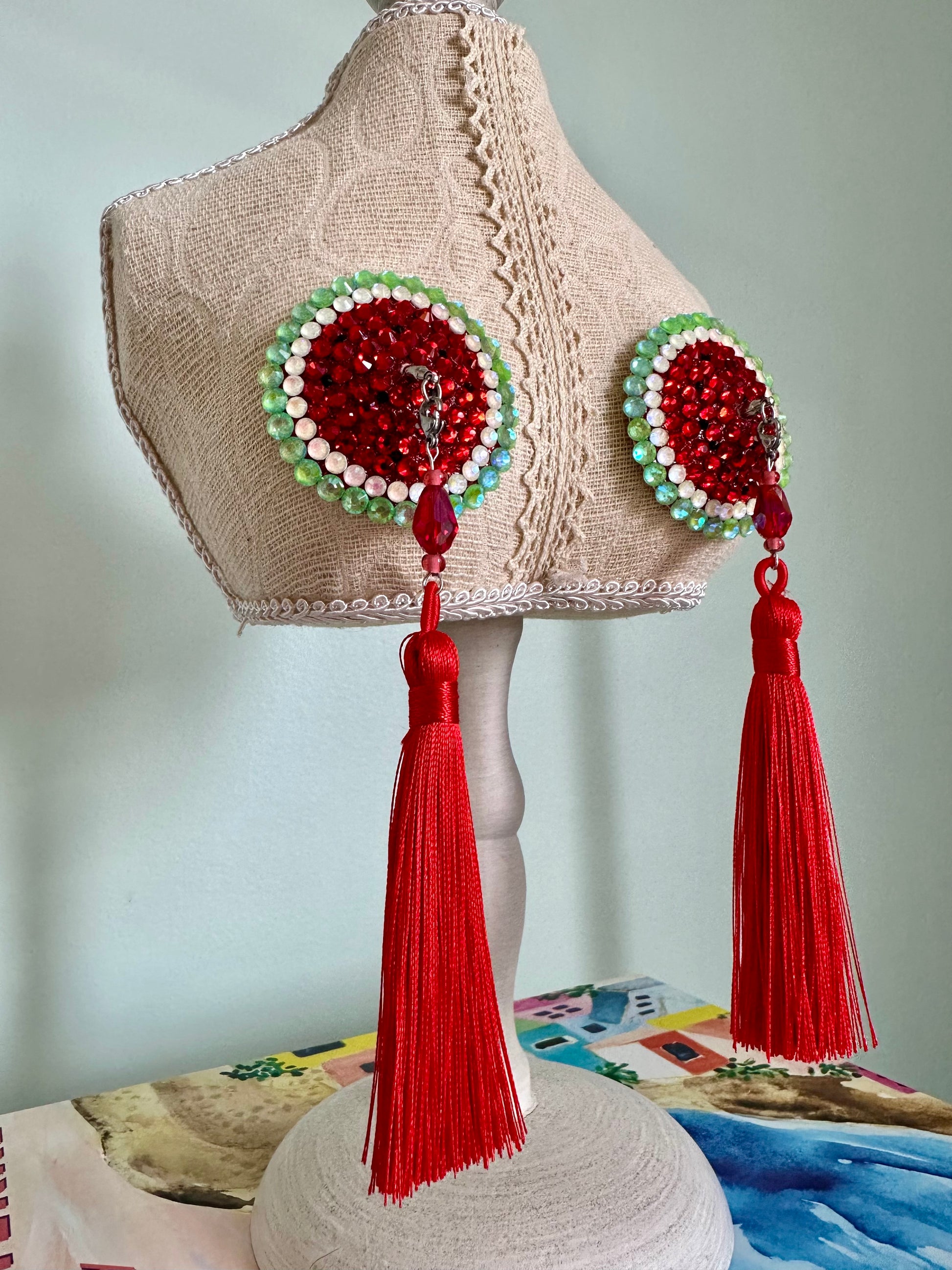Freshly picked, just for you 🍉 These handmade, vegan leather pasties sparkle with intricate designs of crystal rhinestones. These feature removable nylon tassels, with 360° spinners! No worries if things get a little messy—the leatherette material makes for easy cleaning and reuse!
